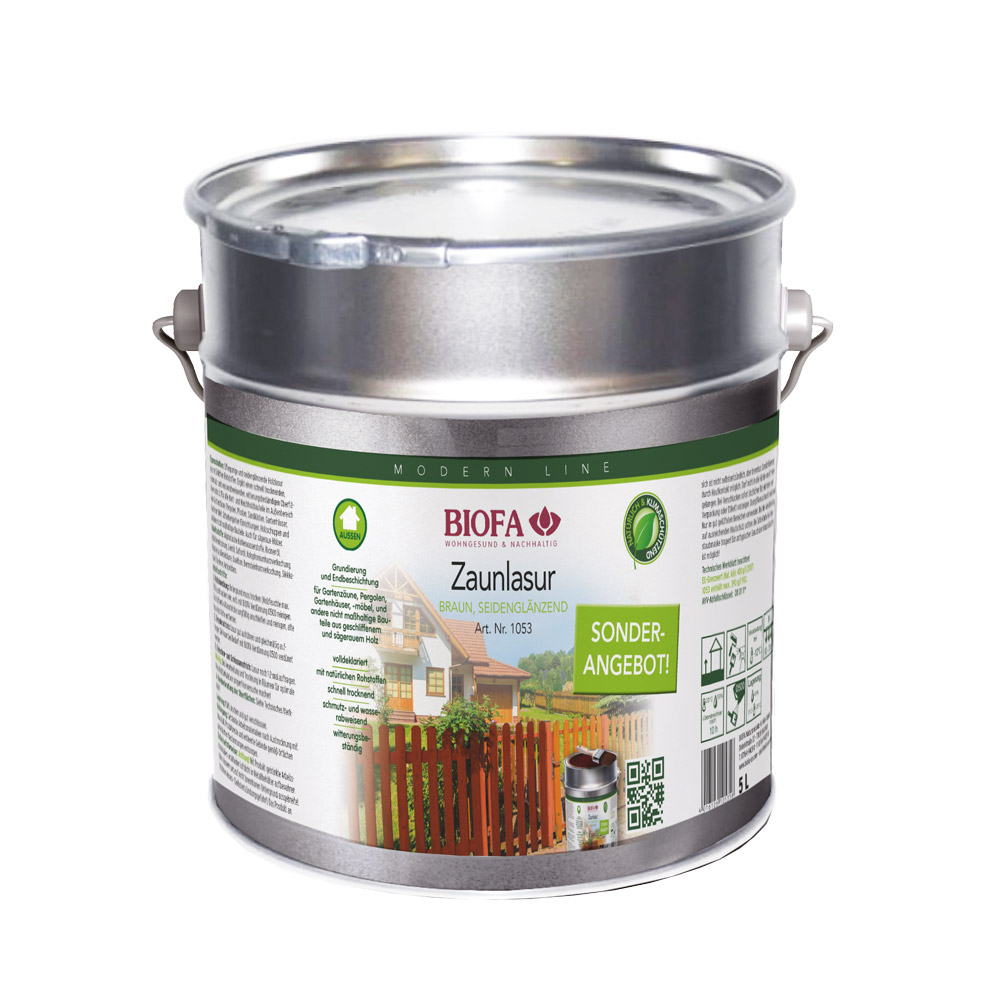 Die braune BIOFA Zaunlasur 1053 ist aus natürlichen Ölen hergestellt und ergibt einen atmungsaktiven, strapazierfähigen und seidenglänzenden Schutzfilm auf Holzoberflächen.