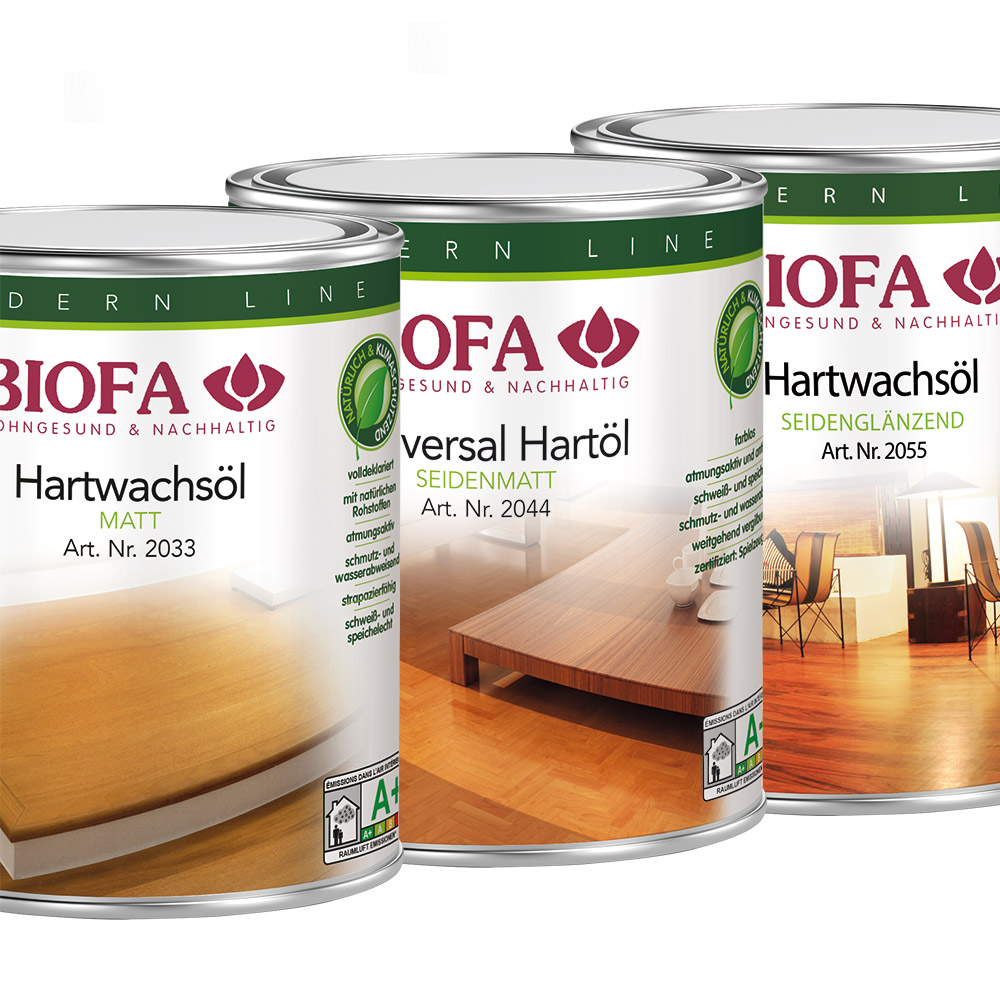 Die farblosen BIOFA-Öle Hartwachsöl matt 2033, Universal Hartöl 2044 seidenmatt und Hartwachsöl 2055 seidenglänzend erhalten den natürlichen Charakter des Holzes und sind sehr leicht zu verarbeiten. Die mit dem Öl behandelten Oberflächen sind offenporig, strapazierfähig, schweiß- und speichelecht sowie vergilbungsarm. Sie unterscheiden sich im Wesentlichen nur im Glanzgrad.