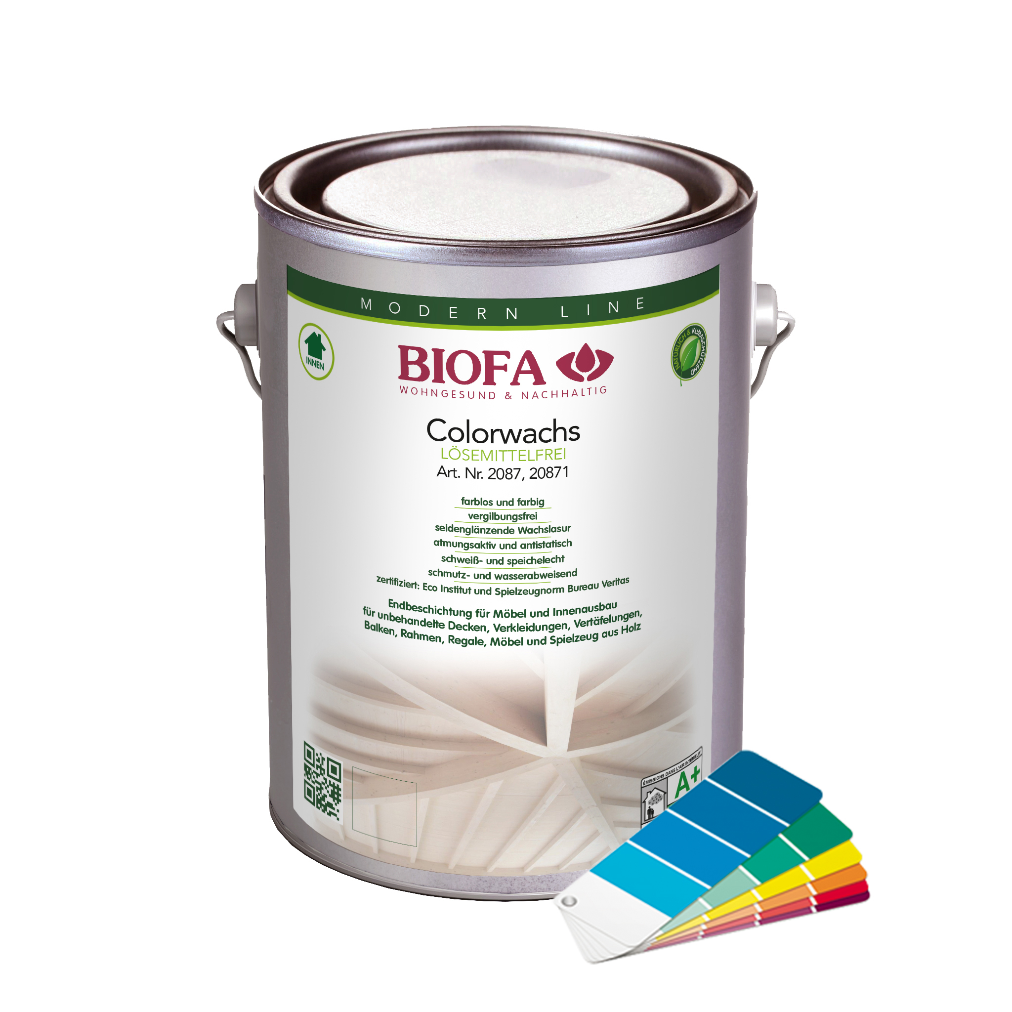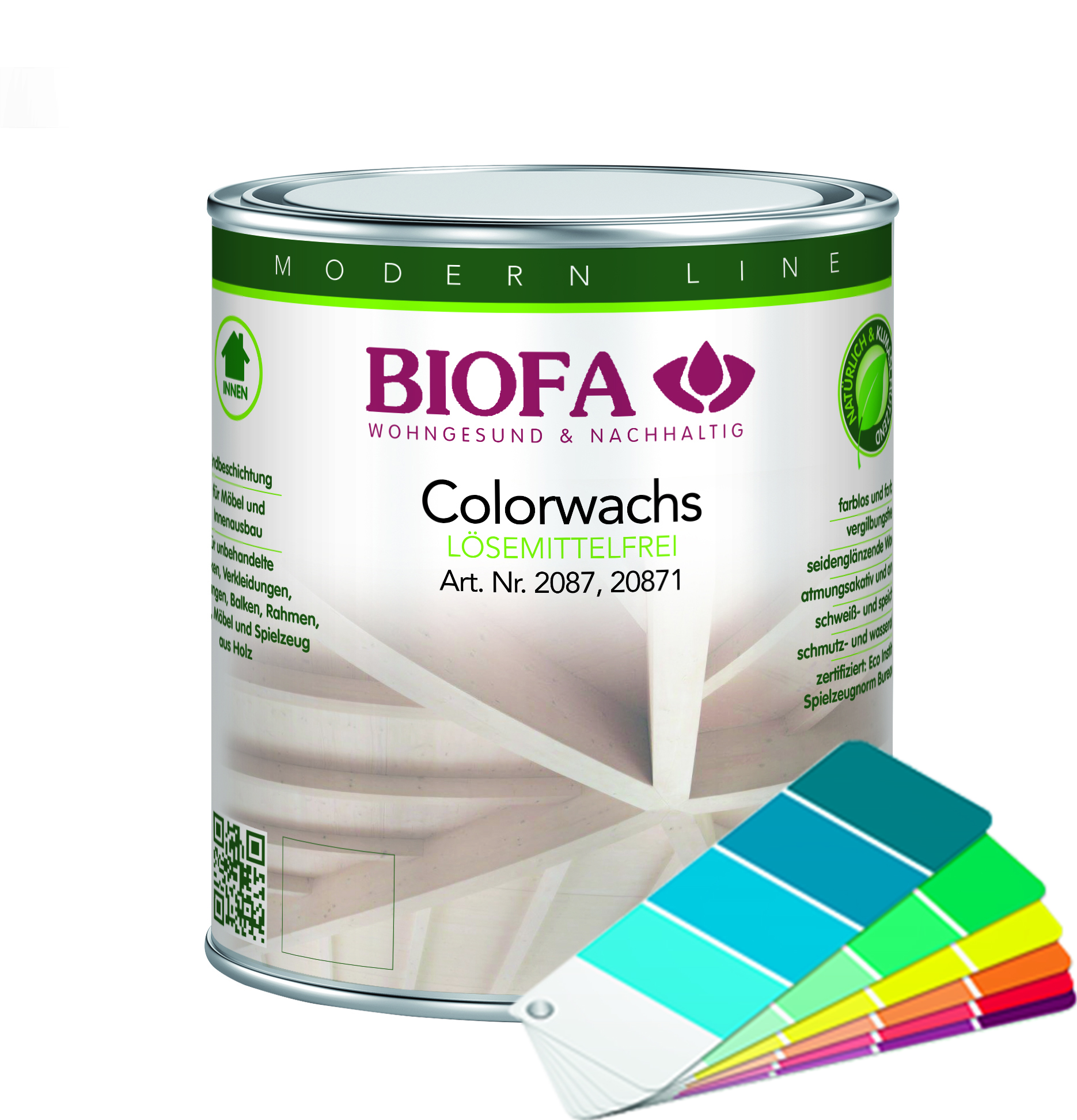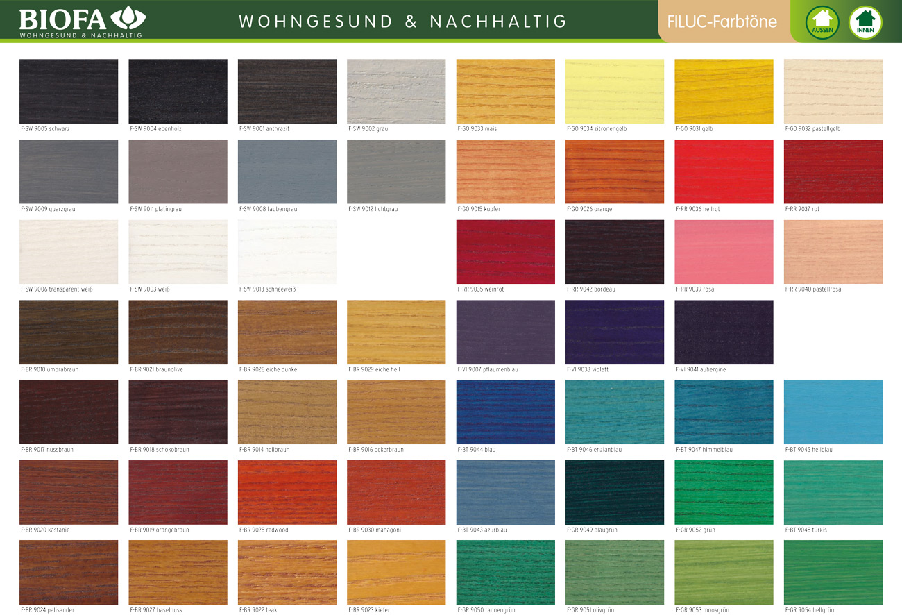 Colorwachs 20871 wird ab Werk nach dem BIOFA FILUC-Farbtonfächer in 54 Farbtönen abgetönt.